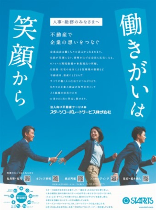 スターツコーポレートサービスの掲げる「社員を笑顔に、法人を元気に、そして社会を豊かに」というミッションのもと、「働きがいは、笑顔から」をキャッチコピーに本広告を制作いたしました。