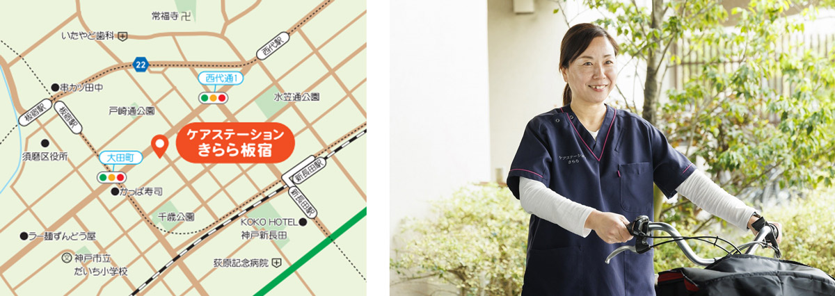『ケアステーションきらら板宿 訪問介護』は、神戸市営地下鉄 西神・山手線「板宿駅」から徒歩7分、本施設の位置する神戸市須磨区は市内でも特に高齢化率の高い地域であり、在宅介護サービスの需要が年々増加しています。