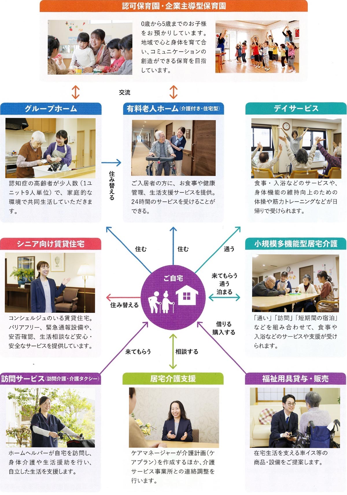 慣れ親しんだ環境を変えずに同じ地域でサービスをご利用いただくことができるよう、介護・保育サービスを展開しています。在宅から施設まで、介護度やご希望に応じたサービスが選択可能となり、お身体の状態などによりサービスの変更が必要となった場合には、同じ地域にてスムーズに利用サービスを移行することができます。