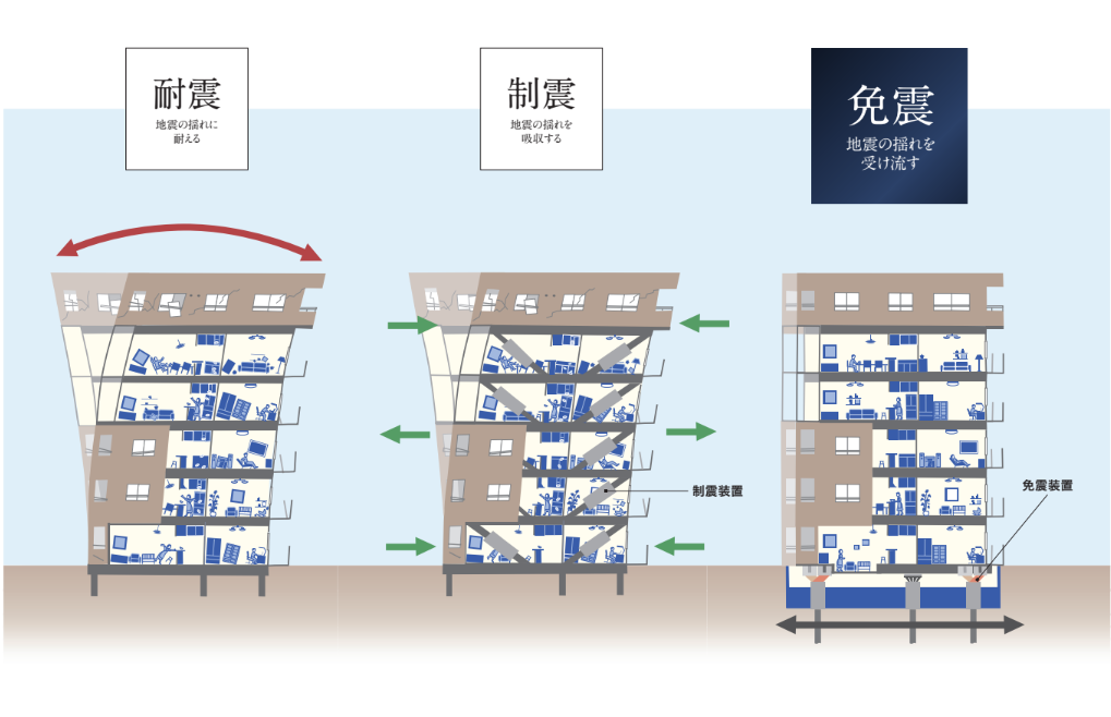 建物が地面から切り離されているため、地震の力を1/3~1/5まで低減し、建物そのものが壊れにくいのはもちろん、室内の家具転倒も防ぐことができます。